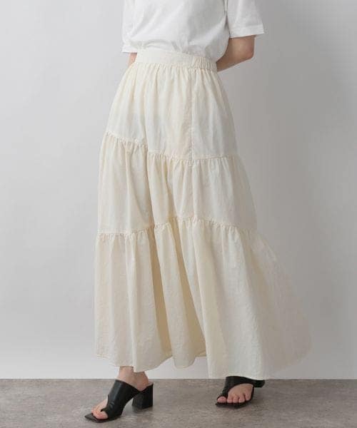 ーーー ■素材特性■ ポリエステル素材に比べ耐久性に優れ、軽く、ハリ感が出るのが特徴です。 硬くなりすぎない用に自然なワッシャー加工を施し上品な光沢感がある素材になっています。 ■デザイン■ 切り替えをジグザグにいれたティアードスカート。 ハリ感のあるナイロン素材のためボリュームがあるロングスカートですが、 軽く、清涼感のあるスカートになっています。 今年らしいコーディネートには欠かせないスカートです。 ーーー ■スタイリング例■ デザイン性のあるティアードスカートなのでトップスにはシンプルなカットソー合わせがオススメ。 ボリュームのあるスカートなので、トレンドの短丈のトップスとも相性良く着用していただけます。