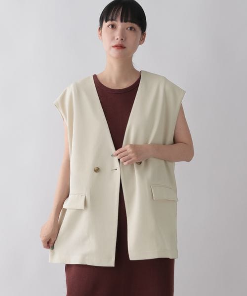 ーーー ■素材特性■ 麻の様なナチュラル感とドライな風合いが特徴的なリネンライクファブリックになります。 ポリエステルの一部にリサイクル原料を使用したサステナブル素材です。 ざっくりとした織りで涼し気でカジュアルな印象の素材です。 吸水速乾性もあり、シワにもなりにくくお手入れ簡単な多機能素材です。 ーーー ■デザイン■ ボトムスとお揃いの素材で作成したベスト。 程よく身幅、裾幅もゆったりとさせています。 ノースリーブでも下に半袖Tシャツなどと合わせやすいです。 前明きの幅を狭めにして、前を開けても広がりすぎずすっきりと着ていただけます。 今シーズンはスカートとの合わせが新鮮でお勧めになります。 ■スタイリング例■ ベスト×ワンピースのスタイリングで合わせて頂いたり、 パンツスタイルにもオススメです。