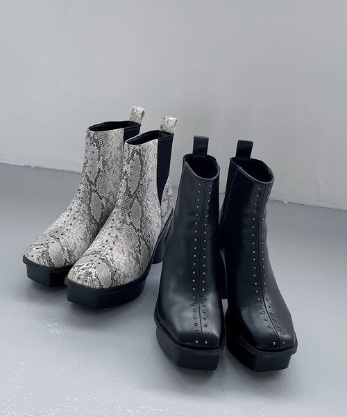 ーーー メタルスタッズパーツが目を惹くブーツ ーーー アッパー部分にガンメタルカラーのスタッズを打ちモードな雰囲気に仕上げたブーツ。 足元にチラッと見えるメタルパーツは目を惹きます。 スクエアトゥ―のモードな雰囲気とヒールは円柱型で安定感をアップ、インソールはクッション性があり履き心地抜群。 サイドゴアで着脱がしやすい仕様が◎ 〈注意事項〉 ・サンプルにて撮影をしておりますので、実際の商品とは素材や仕様・加工・サイズ等が若干異なる場合がございます。 ・モニター・環境等により実際の商品と色味が多少異なって表示される場合がございます。予めご了承をお願いいたします。 ・撮影環境により、光の当たり具合で色味が違って見える場合があります。あらかじめご了承下さい。