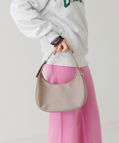 【Design】PUのハーフムーンショルダーバッグ/ハンドバッグ。 コロンとまあるい三日月シルエットが上品で高見えするアイテム。 ミニバッグなサイズながら、マチ付きなので見た目以上に荷物も入ります。 付属のショルダーでショルダーバッグとしてもお使い頂けれる嬉しい2WAY仕様。 きれいめコーデや大人カジュアルな装いにも合わせやすく、トレンドフォルムが毎日のおしゃれをブラッシュアップ。
