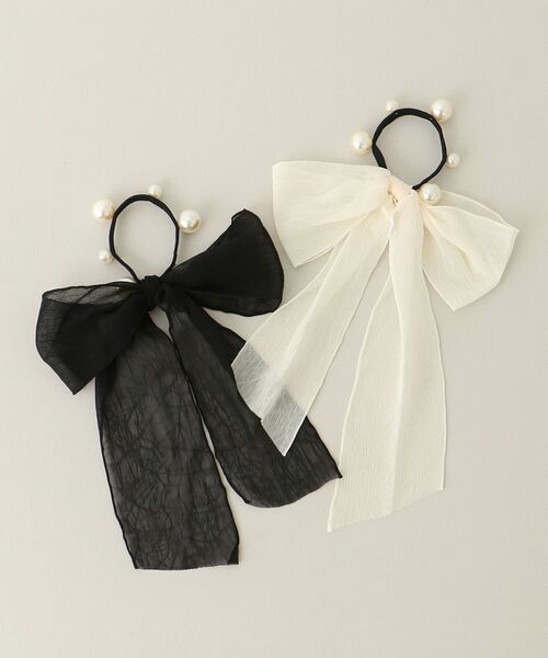 ゴムの部分にもパールが付けられており、細部までこだわったcuteなヘアアクセ☆ ポニーテールやハーフアップに合わせれば、いつものコーデも華やかにしてくれます◎ シアー素材の大きめリボンがポイントで、後ろ姿まで抜かりなくかわいさいっぱいに♪