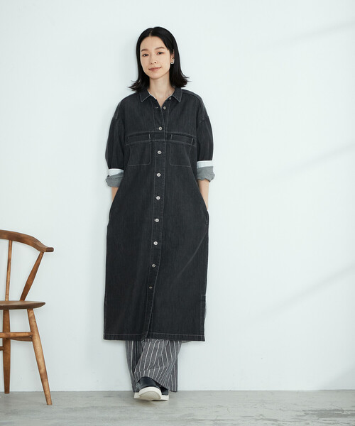 ◆ONIGIRI(おにぎり)のデニム シャツワンピース◆《素材》6.2オンスで軽やかなライトオンスのコットンデニム素材です。程よくハリ感があり、さらりとした肌触りです。洗い加工を施し、デニムの味わいを出しています。また、別地にジャージ素材を使い、やわらかく、着心地良く仕上げました。インディゴカラーとブラックデニムの2色展開です。《デザイン》一枚でワンピースとしても、シャツコートとしても着られる、衿付きのワンピース。ヨークをジャージ素材で切り替え、程よく体にフィットし着心地の良さも特徴です。前身頃の切り替え部分にもジャージー素材を挟み、ポケットでデザインアクセントをプラス。両脇には実用性を兼ね備えたシームポケット付きです。裾は前は直線で、後ろはカーブを付け配色ステッチでアクセントを付けました。横から見た時のシルエットが特徴的。ベルト付きなので、前を開けたり、閉めたりと着まわしにも活躍します。……………………透け感:無し厚さ:普通伸縮性:インレイジャージ部分あり光沢感:無し裏地:無しポケット:あり洗濯方法:洗濯機洗い可……………………※サンプルで撮影している為、実物と若干異なる場合がございます。 予めご了承くださいませ。※画像の商品はサンプルとなりますので実際の商品と仕様、加工、サイズが若干異なる場合がございます。※こちらの商品はFIVE FOXes独自の採寸方法となっています。本サイトのサイズガイドと採寸方法が異なる場合がありますのでご了承ください。
