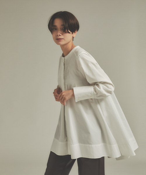 *Detail*細かなタックを施しデザインに拘ったシャツ。 前後見頃にピンタックを加え、裾にもなびくような分量を取ったことで、動きあるシルエットに。 袖はシャツ仕立てにし、甘くなり過ぎず通勤にもぴったり◎ 襟元のボタンを隠しすっきりさせ、クルーネックが上品な印象に。 *Coordinate* クラシカルな印象のシャツ。 シンプルにテーパードパンツも、ベストやジレをプラスしたスタイリングも、どんなスタイリングともマッチするアイテム。 一枚あれば大活躍間違いなしの逸品。 サックスブルー モデル:H170 B81 W59 H85 着用サイズ:F ブラック モデル:H170 B81 W59 H85 着用サイズ:F 洗濯:手洗い可