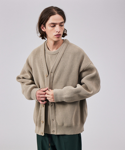 ■デザインゆとりのあるサイズ感のポリエステルニットのカーディガンです。シンプルな洗練されたデザインでトレンド感もあり、男性女性関係無くユニセックスで着用できる嬉しいシルエットです。■素材もちもちとした肌触りがやみつきになる、気持ちのいい生地感になります。ニットの編地特有のストレッチを感じられる素材です。とても軽くてストレスフリーなアイテムです。■スタイリングデニム、ワイドパンツ、カーゴパンツなどのカジュアルなアイテムはもちろん、スラックスのようなキレイめなアイテムまで幅広くスタイリングを楽しんでいただけます。カラー展開も今季トレンドのダークグリーンやインナーでも1枚でも合わせやすいニュアンスカラーのグレー、ベージュ、ブラウンの4色展開同素材、同色のクルーニットソーと合わせるのもありです。同素材クルーニットソー 品番 04450040003