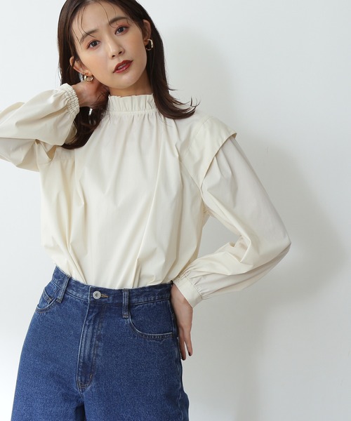 襟もとのラッフルフリルとショルダータックを組み合わせた華やかなブラウス。首もとが少し立ち上がりのあるラッフルネックと、ショルダータックデザインで肩まわりを華奢に見せるデザイン。ほどよいボリュームのあるスリーブやボディラインを拾いすぎないシルエットで着心地よく、背面はタテにボタンを施してポイントをきかせています。スカートにもパンツにも合わせやすく、裾をインして着用するのがオススメです。**********************透け感:ややあり裏地:なし伸縮性:ややあり光沢感:なし生地の厚さ:普通**********************