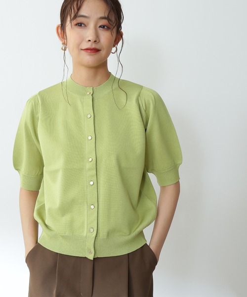 デイリーに万能なパワーショルダーカーディガン。クルーネックで顔周りをすっきりまとめ、ボディラインを拾いすぎないシルエット。ハーフスリーブで、季節の変わり目から取り入れやすく仕上げています。ボトムスを選ばず、ボタンを留めてプルオーバーのように着用するのがオススメです。