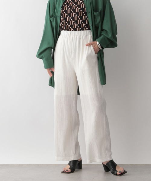 ■素材特性■独特な凹凸のある表面感が特徴的な素材になります。ポリエステル綿とPU使いでソフトな風合いながらもストレッチ性があって、とても穿きやすい素材になります。 ■デザイン■リラックス感のあるイージーパンツなので幅広いトップスと相性良く着用が出来ます。パンツ単体では、チュニック丈のトップスと合わせが〇同素材で、シャツやビスチェを用意しているのでSETUPでも着用可能です。 ■スタイリング例■SETUPでの着用がオススメです。サンダルとのコーディネートで夏らしいコーディネートに♪
