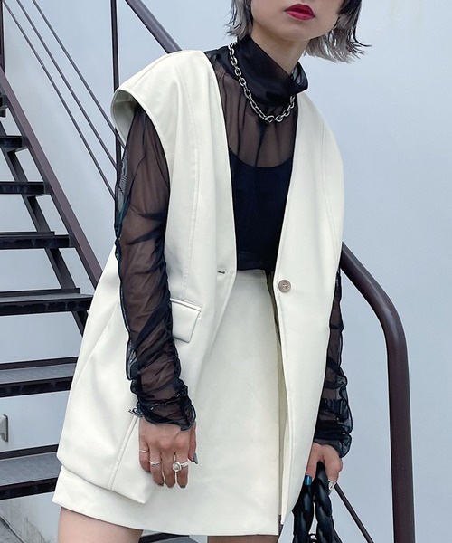 柔らかく滑らかな風合いのフェイクレザー素材を使用したノーカラージレベストすっきりとしたノーカラーにさりげなく入った切り替えデザインがポイント。ゆったりとした肩回りにヒップが隠れるミドル丈で、インナーを選ばずさまざまなレイヤードスタイルに合わせやすい1着。ロンTやスウェットを合わせてカジュアルにも、シャツやシアートップスを合わせてモードにも◎幅広いスタイリングに着用頂けます。普段のコーデにプラスするだけでぐっと今年らしくなる、便利な一枚です。〈注意事項〉・サンプルにて撮影をしておりますので、実際の商品とは素材や仕様・加工・サイズ等が若干異なる場合がございます。・モニター・環境等により実際の商品と色味が多少異なって表示される場合がございます。予めご了承をお願いいたします。・撮影環境により、光の当たり具合で色味が違って見える場合があります。あらかじめご了承下さい。▼気になるアイテムは《お気に入り登録》がおすすめです!完売カラーの再入荷情報、セール情報、ラスト1点の通知を受け取ることができます!▼《ブランドのお気に入り登録》で新商品や再入荷などのお得な情報をいち早くお知らせします。