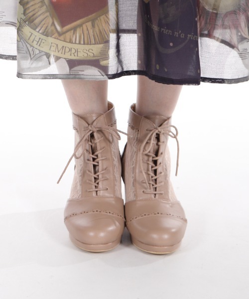 【アイテム説明】 繊細な柄レースを組み合わせたショートブーツです。 細かなレースアップにスカラップデザイン、後ろファスナーには蝶々のチャームを使用し、フェミニンなディテールを詰め込んだアイテム。 太めヒールで安定感があり、歩きやすさも◎ くるぶしより少し上の丈なので、タイツはもちろんソックス合わせもおすすめ。 ボトムを選ばず様々なスタイリングに合わせられます。 ※サンプルにて撮影のため、実際の商品と仕様、加工、サイズが若干異なる場合があります。