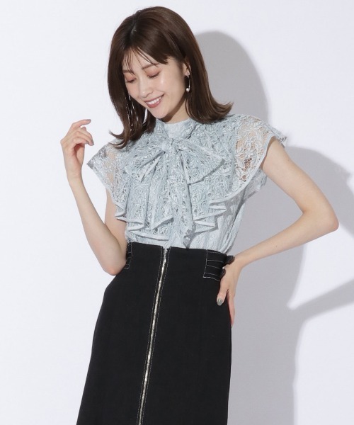 【総レースで纏うケープブラウスはフェミニンで上品な印象に】【Design/Styling】繊細な透け感が、上質でフェミニンな印象のボウタイ付きケープブラウス。ケープデザインが肩回りを覆い華奢魅せを叶えるブラウスです。襟元のボウタイは取り外し可能で、ボウタイなしでもまた違ったスタイリングが完成します。バックデザインはケープデザインからほどよい肌見せが叶うディテールでヘルシーな印象にも◎【Fabric】繊細な総レース生地を使用し、上質でオトナな雰囲気漂うブラウスに仕上げました。シンプルな3色展開で揃えました。ケア方法→手洗いによる洗濯処理ができます。M:(02):着丈50cm バスト90.8cm 肩幅36cm