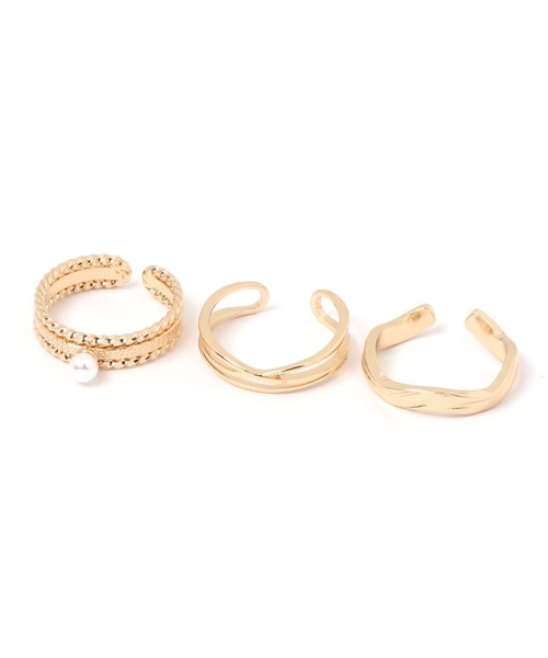 デイリーに使えるフリーサイズリング異なるデザイン3本を組み合わせたニュアンスのあるリングセット。フリーサイズなので色々な指につけやすいのがポイントです。重ね付けにもオススメで、手持ちのアクセサリーとの相性も抜群。