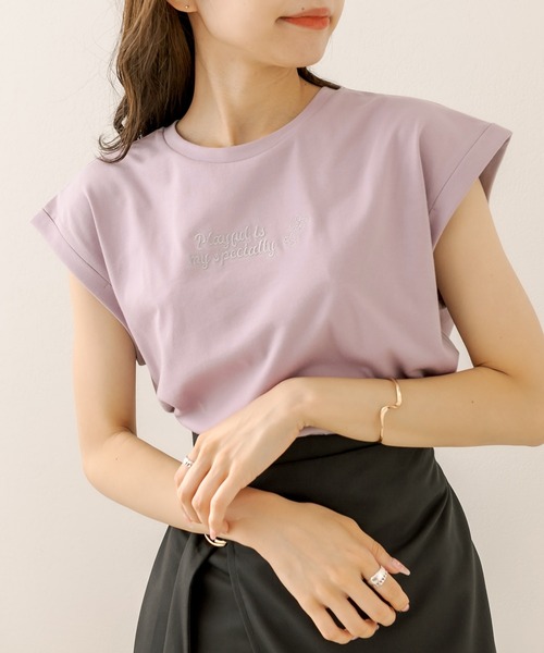 ヘルシーな印象を与えてくれるフレンチスリーブTシャツ ■デザイン ・胸元にさりげないロゴ刺繍がアクセントのTシャツ。 ・肩回りの華奢見え効果も抜群なフレンチスリーブデザイン。 ・ベーシックカラーと秋先取りカラーでこれからの時期に重宝します。 ・そのままでもタックインでも使いやすい丈感で様々なボトムスと合わせていただけます。 ■カラー ・オフホワイト/ブラウン/ブラック/ラベンダーの4色展開 ■スタイリング ・トレンドのスリットスカートやフレアスカートでガーリーに。 ・カジュアルに着たい方はカーゴパンツで韓国風スタイルが◎ ・同系色のボトムでワントーンで合わせると大人っぽいです。 ・足元はサイドゴアブーツやミュールなど雰囲気に合わせてお楽しみいただけます。 ----------------------------- 裏地:なし 光沢感:なし 透け感:ややあり(オフホワイト) 伸縮性:なし ----------------------------- model:166cm ※着用、お取り扱いの際は、商品についている品質表示とアテンションタグを必ずご確認下さい。 ※ご覧のモニター環境や撮影環境により実際の商品と多少色味が異なって見える場合がございます。 ご理解の程よろしくお願いいたします。 ■お気に入り登録のおすすめ【気になるアイテムを登録】ハートをクリックしてお気に入りに登録すると完売カラーの再入荷やラスト1点の通知、セールの通知を受けとることができます。 【ブランドを登録】新商品や再入荷、セール通知など、いち早くブランドの情報を受けとることができます。