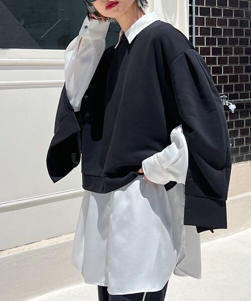 ーーー 袖下の深めスリットが特徴的な裏毛トップス 袖のボリューム感と袖下の深めのスリットがポイントに。 ーーー 袖下のスリット部分は釦仕様になっているので、その日の気分によって釦を開閉しスリットの開き具合を変えられる嬉しいポイント。 釦開きを全開にし、腕やINに着用したレイヤードインナーがチラッと見え、抜け感が◎ カジュアルな裏毛ながらもキレイ目のスタイリングが決まる一枚です。 着丈に前後差のあるデザインで動きのあるスタイリングバランスになります。 ボトムは選ばず、どんなボトムとも相性抜群です。 〈注意事項〉 ・サンプルにて撮影をしておりますので、実際の商品とは素材や仕様・加工・サイズ等が若干異なる場合がございます。 ・モニター・環境等により実際の商品と色味が多少異なって表示される場合がございます。予めご了承をお願いいたします。 ・撮影環境により、光の当たり具合で色味が違って見える場合があります。あらかじめご了承下さい。