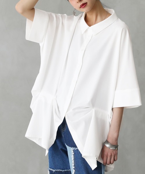 『"シンプル"と"モード"を欲張る。』 印象的なシルエットで魅せる、変形デザインシャツ。 自社オリジナルパターンの裾のデザインタックは、ここにしかない美しいシルエットを生み出す。長めの着丈&六分袖でゆるっとラフにモード感を放ち、バックスリットを入れることで抜け感をプラスします。 さらっと肌触りが良く、着心地の軽い生地を使用。 程よい落ち感があるから、ボリュームが出すぎずすっきりとした着こなしを実現します。 クリーンでモードな世界観に包み込まれる≪ kOhAKU ≫。 服と体の関係性を様々な角度から追及するドメスティックブランド。 スタイリッシュにこなれる≪kOhAKU≫変形裾タックデザインシャツです。