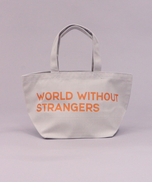 ■DESIGNちょっとしたお出かけ、ピクニック、レジャーにちょうど良いミニトート。コンパクトながら約7Lの内容量はお弁当やペットボトルなどがすっぽりと入るサイズ。正面にはブランドのスローガンでもある「World Without Strangers」を大きくプリント。小さく折り畳むこともできるので、持ち運びが自由なのも嬉しいポイント。 ■FABRIC丈夫なコットンキャンバス生地を使用。ザックリとした温かみのある生地感、肌触りが魅力です。