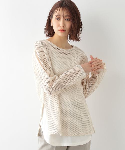 1枚でトレンドコーデが決まるカットソー ーーー 【素材】 メッシュ編みのニットソー素材。 【デザイン】 プルオーバー・インナー共に腰回りが隠れる長め着丈。 メッシュのプルオーバーはサイドにスリットも入っているため裾回りがゆったりするのが嬉しいポイント♪ インナーのタンクトップはラウンドスリットになっていて、 ーーー ニットやトレーナーなど他のアイテムとの重ね着とも相性抜群です。 【お勧めスタイリング】 ウツクシルエットパンツやスゴラクスリムテーパード等のキレイ目なボトム合わせがオススメです。
