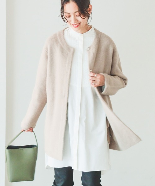 柔らかな肌触りが癖になるひと品 ■デザイン 女性らしいノーカラーデザイン/前身ドッド釦の着脱仕様/釦を閉めてニット風な着こなしも可能 ■サイズ ヒップにかかるゆったりめなボックスシルエット/脇部分はコクーンシルエット ■素材 アンゴラ混の毛吹きのあるふわっとした素材/スムース編みで滑らかかつしっかりとした質感 【TOP.GREY】Model:H163 B83 W63 H92 Size:FREE 【BEIGE・OLIVE】Model:H168 B83 W59 H88 Size:FREE 生地の厚さ:やや厚手 透け感:なし 伸縮性:あり 光沢感:なし 裏地:なし ケア方法:洗濯不可、アイロン可 (詳細は商品についている洗濯表示タグをご覧ください。) 【スタッフレビュー】 スタッフ:今井 陽子 身長:153cm / 普段サイズ:S / 着用サイズ:FREE サイズ感: オーバーサイズでゆったり。丈はヒップがすっぽりと隠れる長さです。 素材感: 柔らかく肌触りのよい素材。伸縮性があり着心地が良い。 ポイント: ジャケットのような雰囲気のカーディガンなので上品な印象に。 ※屋外撮影による光の当たり具合やパソコンなどの閲覧環境によって、実際の色味と異なって見える場合がございます。予めご了承ください。 ※商品の色味は商品単体で撮影した画像をご参照ください。 ◆お気に入り登録のおすすめ◆ 気になる商品には「お気に入り」登録がおすすめです! 登録していただくと再入荷のお知らせやセール通知など、商品の最新情報が届きます。またマイページでいつでも確認が可能になります。 お得な情報が届くこともありますので、是非ご活用ください。