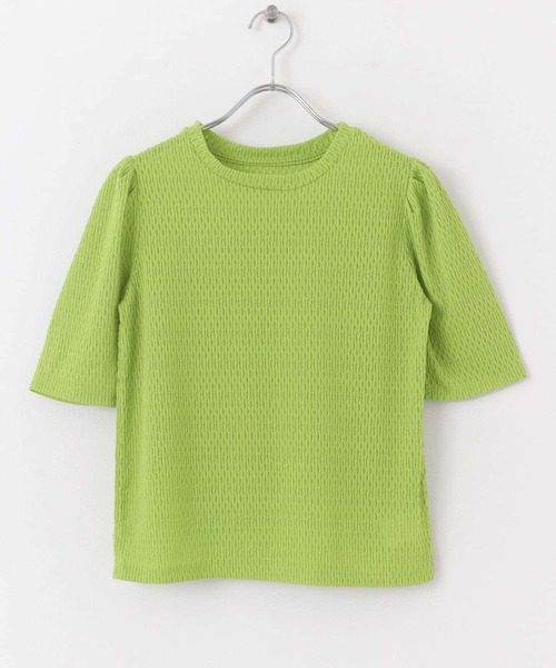 【1枚でもインナーとしてもサマになるTシャツ】表面が特徴的な素材を使用したTシャツ。シャーリンングとカットワークがあわさったようなシンプルながらもフェミニンな印象の1枚。ヘルシーな透け感が季節感たっぷりな着回し力の高いアイテムです。POINT・肩にギャザーの入ったパフのような袖のデザイン・程良い身幅のゆとりCOORDINATE1枚でもサマになりますが、キャミワンピースなどのインナーとして合わせても可愛い◎※摩擦によって他のものに色移りすることがあります。濃淡差があるものとの重ね着には特にご注意ください。※商品画像は、光の当たり具合やパソコンなどの閲覧環境により、実際の色味と異なって見える場合がございます。予めご了承ください。※商品の色味の目安は、商品単体の画像をご参照ください。▼お気に入り登録のおすすめ▼お気に入り登録商品は、マイページにて現在の価格情報や在庫状況の確認が可能です。お買い物リストの管理に是非ご利用下さい。-----------------------------透け感:ややあり伸縮性:ややあり裏地:なし光沢:なしポケット:なし-----------------------------