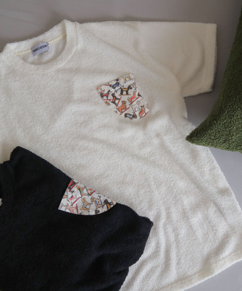SHARES DESIGN / PILE CALM FIN POCKET LOOSE TEE 日本に3台しか残っていない貴重な編み機で作られたパイル生地のTシャツ。 パイル素材のTシャツは数多く販売されていますが、肌に触れない外側がパイルになっている商品 がほとんどです。このTシャツは両面をパイル地にできる編み機で生地を作っています。 ゆっくりと編まれる事で柔らかさが生まれ、タオルを着ているような着心地に仕上げる事が出来ました。 サーフボードのフィンをイメージしたポケットはシェアーズオリジナルの総柄をプリント。 ルーズシルエットのサイズ感はユニセックスで着用できます。 生地から縫製まで全てを日本製で仕上げたこだわりの商品です。 SHARES DESIGN (シェアーズデザイン) アパレルブランドを始め様々なグラフィックデザインを手掛けるデザインカンパニー。 近年は愛犬家に向けた、80種類の犬種から自分好みのオーダーメイド商品が 作れるスマートオーダー商品も展開。 「ペットとのリラックスライフ」をテーマにおしゃれで実用的なアイテムを 展開しています。