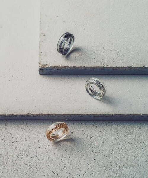 "キャプチャー チェーン リング" 真夜中を駆ける光を捕捉するように。 メタル素材を、クリアな樹脂の中に閉じ込めたコレクション。 シンプルなチェーンリングを、ひとくせあるデザインにアップデート。 浮遊感のあるフォルムで、肌に陰影を落とします。 ボリュームがありながらも軽やかな佇まいで、スタイリングに抜け感をつくります。 ゴールドはクリアな樹脂との合わせで、手元を明るい印象に。 シルバーはどんなスタイリングにも合わせやすく、デイリーユースにぴったり。 クリアなブラックの樹脂を纏ったブラックカラーは、モードなニュアンスを添えます。 サイズ直し:不可
