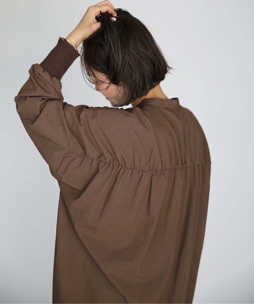 袖のリブデザインがポイントのロングシャツ。ノーカラーにストンとしたシルエットのシャツで、スッキリと洗練された大人な雰囲気に。袖口には異素材リブ、バックにはギャザーを施し、シンプルながらもデザイン性の見える一枚に仕上げました。テーパードなどのすっきりとしたパンツ合わせにもタイトスカートやリラクシーなパンツ合わせにも◎で、一枚取り入れるだけで今っぽいスタイルが叶います。※撮影場所や明るさにより実際の商品と色味が若干異なる場合がございます。 ☆商品のお気に入り♡登録を押せば”再入荷通知”や”残りわずか通知” 値下げのお知らせが届きます!お気に入りのブランド登録していただければ新商品入荷のお知らせも届きますので是非登録してみて下さい