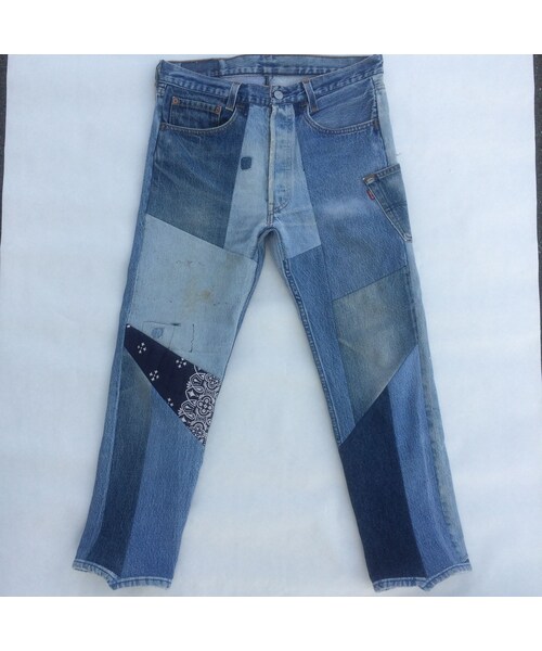 ユーズドのデニムパンツを数本解体し、再構築して創られたデニムパンツです。 デニムの配色は一点一点異なる一点物になります。 シルエットは、独自の切り替えラインによって裾に向かって細くなる特徴的なものになっています。 開きはボタンフライ仕様になっています。 膝部分には、刺し子を施したヴィンテージバンダナを使用しています。 着用モデル 身長180cm ウエスト86cm/股上30cm/股下65cm/裾幅18cm cotton100% MADE IN JAPAN *この商品は一点物のリメイク商品になります。汚れやダメージも風合いと考えています。御理解下さい。色落ちする恐れがありますので他の物と分けて洗って下さい。 *ご注文のタイミングによっては完売となってしまう場合がございます。ご了承下さい。 Impromptu beaT(インプロンプチュービート)は2013年、岡山県で立ち上げられたブランドです。デニムのリペア&リメイク、古着や古布、ミリタリー、その他色々な生地を使って一点物のリメイク商品の製作、販売を行っています。