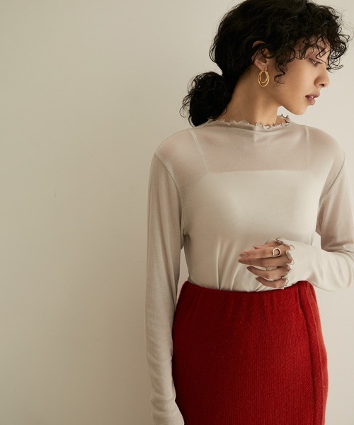 ■デザイン/シルエット衿と袖口に施したメローがフェミニンな印象のシアーTシャツ。絶妙な透け感がシンプルながらスタイルのアクセントとなります。女性らしい印象の体に寄り添う細身なシルエットですが、タイトすぎず程よいゆとり感もあります。程よい高さのボトルネックタイプなのでタートルネックが苦手な方にも。■素材毛羽を落とした極強撚糸を使用しています。ガーゼ調に編むことでふくらみのある優しいタッチに仕上げています。さらりとしたタッチで着心地の良い素材です。シアー素材なので暑い時期にも着られます。■コーディネート一枚での着用から、ベストやジャケット、キャミワンピースのインナーとしても。シンプルなクルーネックのニットとレイヤードして襟や袖のメロウを出すとスタイリングのポイントになります。オールシーズン着回し可能な万能アイテムです。■クルーネックタイプのシアープルオーバーもございます。商品番号:SHM32450商品名:シアークルーネックプルオーバー■モデル身長:165cm 着用サイズ:F-----------------------------裏地:なし光沢感:なし透け感:あり伸縮性:あり生地の厚さ:薄手-----------------------------