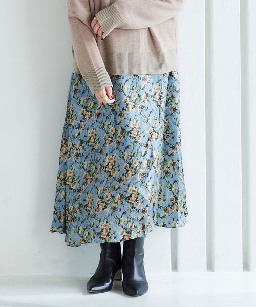 【大人気のIPEKER】ルクールブランで大人気のトルコ「IPEKER社」の目を惹くフラワープリント生地を使用した華やかで上品なフレアスカートの登場。インポート生地ならではのフラワープリントが可愛いスカートです。カラー使いがアクセントになり華やかスタイリングを完成させてくれるスカートは落ち感のあるシルエットで、広がらずすっきり見え◎軽やかな素材感で歩く度に揺れる雰囲気が女性らしさを演出してくれます。きれいめなブラウスとの合わせはもちろん、カジュアルダウンでTシャツやデニム、スウェット合わせもおすすめです。普段柄物を着ない方でも、優しいカラーなので取り入れやすいのも嬉しいポイントです。====================透け感:なし裏地:あり伸縮性:なし光沢感:あり生地の厚さ:薄手====================