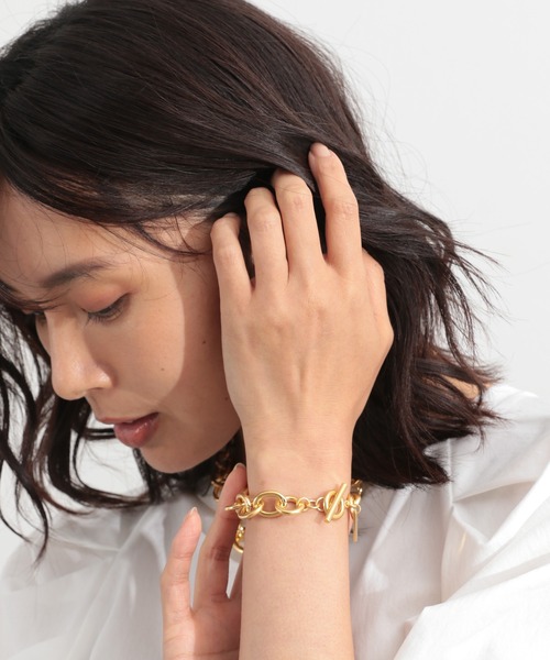 手首の華奢見えが叶うボリューム感の華やかブレスボリューム感のあるチェーンで作ったブレス。手首を華奢に見せてくれ、コーディネートに華やかさを加えてくれる1点です。【スタイリング】シンプルなTシャツやノースリーブの日にも頼れる存在感のあるブレスです。秋は袖にスリットがあるデザイントップスから覗かせても素敵!「356628:コンビチェーンボリュームネックレス」とセットで付けるのもおすすめ。この商品はセミマット仕上げをしています。汗や皮脂、香水、クリームなどの付着や、ご使用時の摩擦により徐々にマット加工がとれて光沢がでてきますが不良ではございませんので経年変化をお楽しみください。※サンプルにて撮影をしておりますので、実際の商品とは色味・仕様や加工・サイズ等が若干異なる場合がございます。予めご了承くださいませ。お買い物をお得にもっと楽しく!上手な活用方法>>>▼商品のお気に入り登録▼完売カラーの再入荷通知や、ラスト1点の通知、プライスダウンしたセール通知も受け取ることができます。▼ブランドのお気に入り登録▼新作や再入荷等、いち早くブランドのお得な情報を受け取ることができます。【ご注意】・屋外の光や照明の当たり具合で、実際の商品の色味とカラー別画像の色味に若干の違いが発生する場合がございます。 詳細画像と併せてご確認の上、ご注文いただきますようお願い致します。