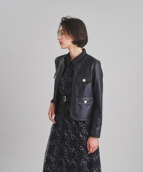 様々なスタイルに投入できる、着回しが効くノーカラータイプのレザージャケット。角のない優しいディティールやきらりと艶めくメタルボタン、そしてフロントはボタンレスで仕上げた女性らしいデザインです。着るごとに身体に馴染んで味わい深く変化する、軽くしなやかなラムレザーでお作りして、飽きずに末永くご愛用いただける一枚に。スイッチシーズンの定番ワードローブとしてご活躍いただけるアイテムです。・こちらの商品はサンプル品を撮影しております。実際の商品と仕様、加工、サイズが若干異なる場合がございます。予めご了承下さいませ。