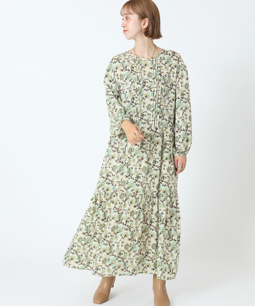 【2022AW】 B.C STOCK 今季トレンドのフェミニンワンピースが登場! 表面感のある素材にピンタックのデザインを施した一枚。 存在感のあるデザインながら、甘さを抑えたカラー展開も魅力です◎ 一枚着としてはもちろん、スエットやニットとのレイヤードスタイルにもぴったりです◎ ご自宅で手洗い可能なイージーケアも嬉しいポイントです。 ●シリーズ商品 プリントブラウス(品番:22051700700230) ※カラー:グリーン(030)のみ共通の生地で展開しております。 ********************** 透け感:ややあり 裏地:あり(ウエストから下) 伸縮性:なし 光沢感:なし 生地の厚さ:普通 ********************** 【スタッフ着用コメント】 《スタッフ staff.s》 身長:165cm/普段サイズ:S~M/着用サイズ:フリー サイズ感:身幅がゆったりとしていて、着丈は足首が出るくらいの長さです。幅広い体型の方にお楽しみ頂けます。 素材感:柔らかく軽やかな素材感。気になる部分には裏地が付いているので、インナーの透けは気になりませんでした◎ 着心地: きちんと見えですが、リラックス感のある着心地です。通勤からデイリー使いまで、汎用性の高い一枚です。 ********************** 《スタッフasako》 年齢:30代前半/身長:153cm/体型:普通/普段サイズ: S~M/着用サイズ :フリー サイズ感:ゆったり着られるサイズ感で、シルエットを拾いにくいゆとりがありました。 素材感:動くとふんわり揺れる、軽い素材感です。 着心地:やや薄手の素材感ですが、スカート部分は裏地も膝下まで付いているので、インナーの透けは気になりませんでした◎ ********************** ※カラーについて カラー:ナチュラル(016)、ブラウン(020)、ボルドー(066)は透かしのボーダー柄、グリーン(030)は花柄です。 ※素材について こちらの商品はカラーごとに素材が異なります。 【ナチュラル・ブラウン・ボルドー】表地:レーヨン90%、ナイロン10% 裏地:ポリエステル100% 【グリーン】表地:ポリエステル100% 裏地:ポリエステル100% ※取り扱いについては、商品についている品質表示でご確認ください。 ・洗濯 品胎:手洗い可 ・汗が付着した場合は、早めにお手入れしてください。そのまま放置すると色落ちや色移りすることがあります。 ・水洗いで多少縮みます。 ・摩擦や洗濯などで白化、毛羽立ちが起こり、色落ちすることがあります。 ・配色が濃淡の製品は、色移りすることがあります。 ※店頭・屋外での撮影画像は、光の当たり具合で色味が違って見える場合があります。商品の色味は、スタジオ撮影の画像をご参照ください。 モデルサイズ:H165 着用サイズ:フリー 本体:手洗い可能