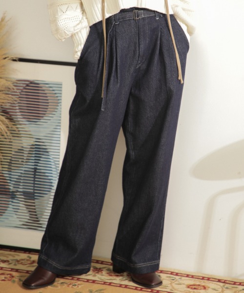 甘織のデニムを使用したタックパンツ ・WASH加工で風合いを出しています。とてもやわらかく肌なじみの良い組織 ・共布のベルトは長く垂らすのがポイント ・国内ならではの素材感。柔らかく、甘編みの綾織り組織 【スタッフレビュー】 タックが入っているので太めのストレートシルエットも ウエストはすっきりしたまま綺麗に履いていただけます。 ハイウエストのデニムなのでトップスのインスタイルにも丁度良いバランス。 【取扱注意事項】 モデルの着用画像の場合、光の当たり具合により、実際の色味と異なって見えることがございます。色味は、商品生地の画像をご参照ください。