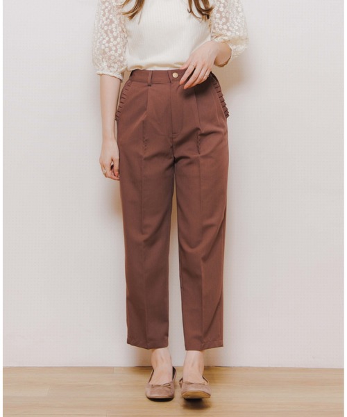 腰回りやヒップにほどよくゆとりをもたせたflower定番人気のシルエットでお作りしたテーパードパンツ♪落ち感のあるとろみ生地を使用し、キレイめな印象に仕上げました。ポケットにはフリルをあしらい、さりげないポイントに。センタープレス入りでスタイルアップが叶います。smoky short shirtとコーディネートもおすすめです。デイリー使いはもちろん、キレイめなのでオフィスカジュアルにもおすすめです。♡おすすめコーディネート♡すっきりとしたシルエットなのでブラウスやビスチェなど動きのあるトップスと好バランスです。リブトップスなどキレイめなアイテムと合わせればオフィスシーンにも◎【お買い物を上手にお楽しみいただくためのPOINT2つ】◎ 購入ボタン横の ♡ (ハートマーク)をクリック! 完売カラーの再入荷通知、残り1点の通知、セールの通知を受け取れます。 (クリックまたはタップで商品のお気に入り登録♪)◎ ショップのトップページにある ♡ (ハートマーク)「お気に入りショップに追加」をクリック! 新商品や再入荷等、いち早くブランドのお得な情報を受け取れます。 (ブランドのお気に入り登録♪)
