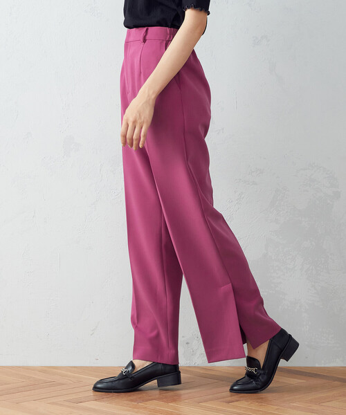 《素材》きれいな表面感と、さらりとした肌触りが特徴。2WAYストレッチでタテ・ヨコに伸縮性があり着心地抜群です。《デザイン》センタープレスとサイドスリットのデザインを入れ、すっきりとしたきれいめなデザインのパンツ。膝より高い位置で少し絞りを入れ、視覚的に脚が長く見えるようこだわりました。きれいめなワイドシルエットと、今シーズンらしい3色のカラーバリエーションが魅力です。……………………透け感:なし厚さ:中肉伸縮性:有り光沢感:なし裏地:なしポケット:有り洗濯方法:洗濯機可……………………※画像の商品はサンプルとなりますので実際の商品と仕様、加工、サイズが若干異なる場合がございます。※こちらの商品はFIVE FOXes独自の採寸方法となっています。本サイトのサイズガイドと採寸方法が異なる場合がありますのでご了承ください。