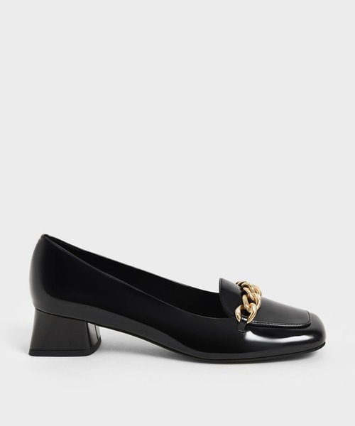 【オンラインストア・一部店舗限定アイテム】 艶感の綺麗な素材にローファー風のディティールを取り入れて、遊び心たっぷりに仕上げたユニークなパンプス。 アッパーにチェーンとパールのアクセントを添えて、モードなスパイスをプラスしました。 すっきりとした細身のシルエットと、つま先はスクエア型の今年らしいデザイン。 太く安定したヒールも日常使いに嬉しいポイントです。 いつものコーデにプラスして、エッジの効いたワンランク上のファッションをぜひお楽しみください。 ※靴底の保護シールは剥がして着用下さい ※STAFF着用レビュー/22.5-23/足幅広め/35サイズでちょうど良かったです。艶めくパテント風の素材を使用し、アッパーにチェーンを飾ったアイコニックなデザインです。高すぎないミドルヒールが普段使いしやすく、ヒールが苦手な方にも取り入れやすいデザイン。コンサバ過ぎないパンプスをお探しの方におすすめの一足です。