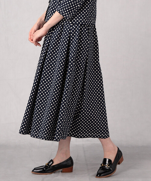 モード感のある、ふんわりタックスカート。ドットプリントが相まって、フレンチカジュアルなスタイリングを演出します。ヨコ糸にストレッチ性のあるウーリー糸を使った、キュッと詰まった感じのポリエステルブロードを使用。7mm玉のドットをプリントし、アクセントにしました。ある程度のハリ、コシを出し、シルエットを作りやすくし、高級感を出しています。その素材感に加えて、タックを重なり合わせ、ふんわりとしたボリュームのあるシルエットを作っています。エレガントな雰囲気を持ちながらも、ウエストはゴム仕様で、やさしい履き心地。同素材のジャケット(80-20JA01-202)と合わせ、セットアップとしても着られ、単品としてもスタイリングにアクセントを加えます。※在庫がない場合もございますので、予めご了承くださいませ。…………………….…….…….…透け感:なし厚さ:ふつう伸縮性:ややあり光沢感:なし裏地:なしポケット:なし洗濯方法:手洗い…………………………..…….…※画像の商品はサンプルとなりますので実際の商品と仕様、加工、サイズが若干異なる場合がございます。※こちらの商品はFIVE FOXes独自の採寸方法となっています。本サイトのサイズガイドと採寸方法が異なる場合がありますのでご了承ください。