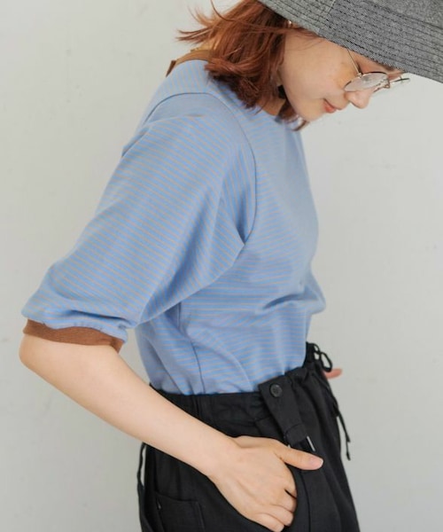 前後2way仕様で雰囲気を変えた着こなしが楽しめるリンガーTシャツ。 細めのピッチのボーダー柄で大人カジュアルな印象にしてくれます。 ゆったりとしたサイジングで身体のラインを拾わず華奢見え効果も◎ スナップボタンで着脱しやすくアクセントをプラス。 羽織りとしてはもちろん、前後2way仕様なのでボタンを後ろにして着用することで プルオーバーとしても活躍する、コーディネートの幅が広がる1枚です。 衿と袖口のパイピングが目を惹きポイントになります。 肘にかかる絶妙な袖丈で気になる二の腕をカバーしてくれるのも嬉しい◎ 肌触りの良いコットン100%。 伸縮性のある柔らかな素材で快適に着ていただけます。