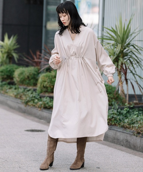 ◆程よい光沢と落ち感が女性らしく大人っぽい雰囲気の一枚でもレイヤードでも決まるカジュアルワンピース ◆ <MATERIAL> しっとりとしたリヨセルコットンのツイル素材です。 リヨセル繊維特有の上品な光沢と落ち感が特徴です。 分量のあるデザインでも素材のドレープ感で適度に身体に生地が添い、ギャザーの表情も柔らかく表現できるので、大人っぽく女性らしい雰囲気を作ることできます。 程よい中肉厚で透けにくく、なめらかな肌触りが心地よい素材です。 そのままだとキレイ目な雰囲気ですが、仕上げにワンウォッシュ+タンブラー乾燥することにより、フィブリル感のあるこなれた表情に仕上げています。 <DESIGN> たっぷり分量を取ったリラックス感のあるシルエットのシャツワンピースです。 フロントの切替え部分を同素材の紐で絞ってギャザーの分量を調整することができます。 ギャザーの柔らかな表情を持たせつつ、テーラー風の衿とメタルのコードストッパーでシャープなエッセンスもプラスしています。 衿やヨークに入れたステッチと、最後に洗い加工を入れることでカジュアル感を出しました。 袖口はゴムで伸縮し楽に着られる仕様ですが、ギャザーだけではなく、タックも入れた凝ったデザインになっています。 後ろの着丈を長くし、脇にスリットを入れた動きのあるデザインになっています。 ワンピースとして一枚で着るのはもちろんのこと、レギンスやパンツを合わせるスタイリングもおすすめです。 <COLOR> ■ネイビー:シックなネイビー。フィブリル感のあるこなれた表情があり、重くなりすぎずに着やすい一枚です。 ■ライトベージュ:女性らしさのある明るいベージュ。やわかい印象で着られるカラーです。 ■カーキ:グリーンみの強いカーキ。カジュアルに合わせやすく、秋冬らしさのあるカラーです。 ※光のあたり具合いやパソコンなどのモニター環境によって実際の色味と異なって見える場合がございます。予めご了承ください。 ※着用商品はサンプルです。サイズ等の仕様に若干の変更がある場合がございますので、予めご了承ください。 *お取扱いについては、商品についております品質表示、アテンションタグにてご確認ください。 洗濯:洗濯機洗い可 .............................≪INFORMATION ≫............................ ▼商品のお気に入り登録▼ 『♡』マークを押してお気に入り登録して頂いた商品は、セール開催の通知やクーポン発行などのキャンペーンなど、お得な情報をいち早く受けとる事が出来ますので、ぜひご登録ください。