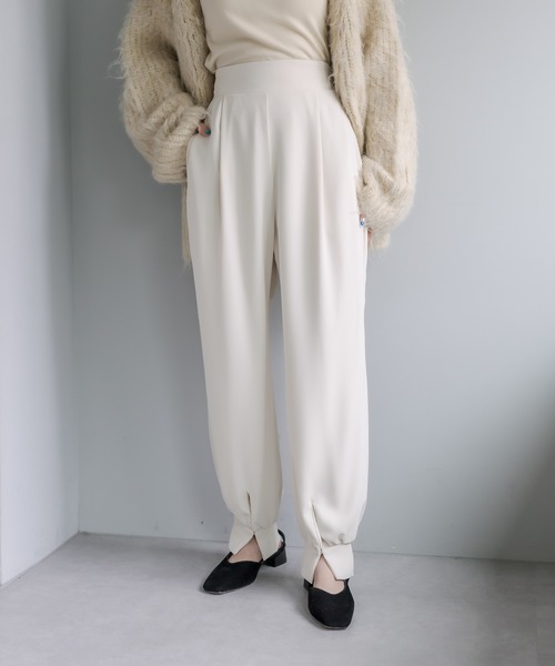 履き心地抜群!ストレスフリーなこなれ見え間違いなしの美脚見えパンツ! 商品ポイント ・さらっとした落ち感のある素材感のノンストレスパンツが登場。 ・足元にかけてすっきりと詰まるデザイン。 ・脚のスリットデザインはボタンを開閉できるのでスタイリングに合わせて着用して頂けます。 ・ウエストはゴム仕様となっており着心地抜群。 スタイリングポイント ・ハイウエストデザインなのでコンパクトなビスチェやインスタイルで合わせるとスタイルアップ見え間違いなし! ・足元はヒールのあるブーツに合わせて頂くとより女性らしい印象に◎ ※洗濯、取り扱い 洗濯:40度限度 手洗い アイロン:低温110℃まで スチームなし(あて布使用) タンブル乾燥:不可 ------------------------------------------------------ 裏地:アイボリーのみ有 伸縮性:ややあり 光沢感:ややあり 生地の厚さ:ふつう ------------------------------------------------------ ------------------------------------------------------ 商品のお気に入り登録➡ お気に入りアイテムの値下げ・再入荷・在庫1点などの通知を受け取ることができます。 ブランドのお気に入り登録➡ 新商品や再入荷、セール、クーポン配布などお得な情報を受け取ることができます。 ※サイト上のカラー名と、お届け商品に記載されているカラー名が異なる場合がございます。 ※商品の色味は、撮影場所や光のあたり具合などにより色味が違って見える場合が御座います 。 また、お客様のお使いのPCのモニター環境などにより色味が違って見える場合が御座います。予めご了承の上ご注文下さい。 ※ご注文いただいた予約商品のお届け時期の確認は、注文履歴ページより行えます。 ------------------------------------------------------"