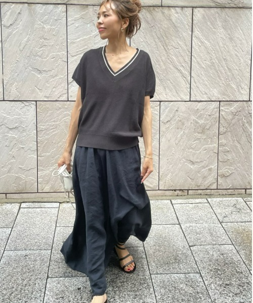 麻のようなさらっと清涼感のあるドライなタッチは、タンクトップやTシャツあわせにもおすすめ。 スポーティなムード感のあるラインがすっきりと落ち着いた雰囲気です。 ワンピースやデニム、ボリューミーなロングスカートとも相性よく、秋口まで着回しのきくアイテムです。