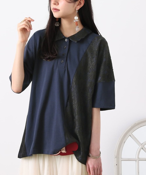 『大人のセンスを惹き立てる。』 ラフに大人のお洒落可愛いを演出する、異素材トップス♪ 色使いにこだわった、上品な印象溢れる花柄レースの切替デザイン。ゆるっとこなれたシルエットに、ポロシャツの襟元ディテールでカジュアルさも手に入ります。 コットン100%の肌触りの良いカットソー生地と、繊細で豪華な花柄レースの組み合わせ。 お好きなシルエットが選べるM~3Lサイズ展開です。 「可愛さ想像以上」を体現する≪ somari imagination ≫。 洗練された大人の女性らしさとどこか懐かしい雰囲気を醸し出すデザインライン。 他にはないデザイン性が光る一着≪somari imagination≫レース切替カットソーポロシャツです。