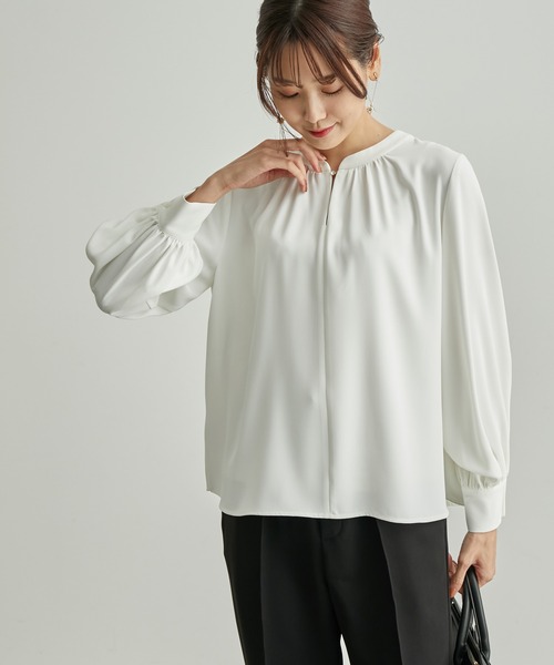 きらめくパーツが華やかさをアップ。さりげないフェイスチェンジが楽しめる2WAY。 【素材感】 ・リサイクルポリエステルを使用したサスティナブルなアイテム。 ・きれいめなジョーゼット素材を使用。 【デザイン・シルエット】 ・スリットネックの橋渡しになるビジューモチーフのフックがポイント。 ・前後逆に着られる2WAYデザイン。 ・ロングカフスでメリハリを出したボリュームスリーブがフェミニン。 ・オンラインストア限定展開商品。 【カラー】 ・ニュアンストーンを揃えた、全5色をラインナップ。 【スタイリングポイント】 ・シンプルなテーパードパンツやフレアスカートに合わせて通勤仕様に。 ・普段使いなら、あえてジーンズに合わせてもOK。 ----------------------------- 裏地:なし 透け感:なし、オフホワイト(15)はややあり 伸縮性:ややあり 生地感・厚さ:普通 季節:春・秋 ----------------------------- ※撮影時の光、お使いのモニター環境によって色の見え方が違う場合がございます。 ※前回好評だったビジューホックブラウス(品番:GDH22000)と同型、仕様変更等ございません。 ※チャコール(06)ネイビー(40)モデル身長:165cm 着用サイズ:38 ※オフホワイト(15)ラベンダー(52)イエロー(80)モデル身長:165cm 着用サイズ:38/155cm 着用サイズ:38