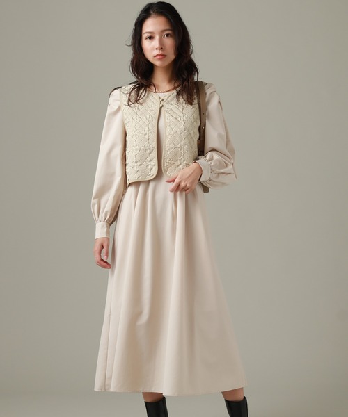 着るだけでワントーンレイヤードスタイルが完成*キルティング生地でシーズンムード高まるアイテムです■point・着こなしの幅が広がるセットアイテム・秋冬定番人気のキルティング生地を使用・立体感のあるこだわりのシルエット■detailワンピースとキルティングベストがセットになったアイテム。秋冬定番人気のキルティング生地は、スタイリングに奥行きをだしてくれ、サイドのリボンがアクセントに♪ワンピースは肩にギャザーが寄せられたややボリューム感のある袖や、ふんわり揺れ感のあるフレアシルエットで1枚でも着映えるシルエットに。同色なので、まとまりのあるレイヤードスタイルが完成するアイテムです*■coordinateキルティングベストは、閉じて着るのはもちろん、フロントのボタンを開けてすっきりと着こなすのも◎ワンピースは単品使いでジャケット合わせなどもおすすめです*■素材素材:【ワンピース】【表地】ポリエステル 80%/レーヨン 20%【裏地】ポリエステル 100%【ベスト】【表地】ポリエスエル 100%【裏地】ポリエスエル 100%【別布部分】ポリエスエル 80%/綿 20%**********透け感…なし裏地…あり伸縮性…なし光沢感…なし生地の厚さ…厚い**********※画像の商品はサンプルです。実際の商品とは仕様・加工・サイズ・素材が若干異なる場合がございます。※生産の都合により納期は変更となる場合がございます。※撮影場所やお使いのモニター環境により若干お色味が異なる場合がございます。■商品のお気に入り登録■ラスト1点の通知やセール通知、また完売していても再入荷時に再入荷通知を受け取ることができますので、是非ご登録ください♪■ブランドのお気に入り登録■新商品や再入荷など、お得な情報を受け取ることができます!ぜひご活用ください!