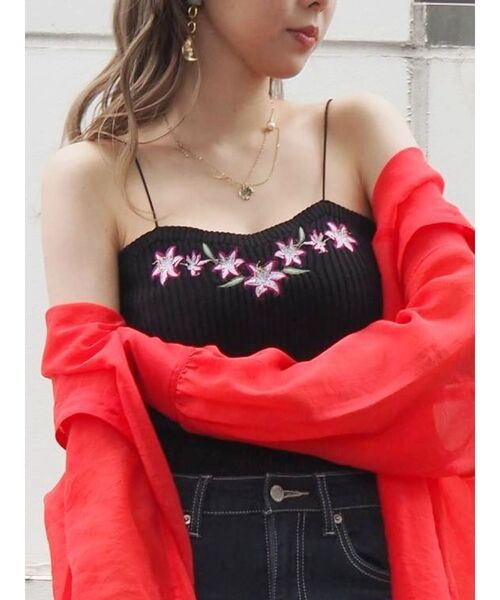シャリ感のあるニット素材を使用したキャミソールです。ボディーと刺繍を配色にしており、EVRIS(エヴリス)らしいオリジナル感の組み合わせとなっております。1枚で着たり、羽織のインナーとしてインパクトのあるスタイリングもオススメです。