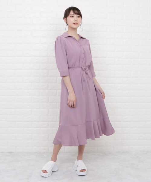 オープンカラーミモレ丈フレアワンピース エアリーなフレアシルエットが魅力のシャツワンピース 深めに開いたオープンカラーはデコルテをキレイに見せ、顔周りにすっきりとした印象を持たせます◎ 袖はややボリュームのある五分袖で、気になる腕周りをしっかりカバーします。 ミモレ丈のフレアシルエットで美脚効果も抜群! 裾は1段のティアードデザインがアクセントになり、優雅な揺れ感を演出します♪ カラーはシックで使いやすいブラック、くすみカラーが大人可愛いラベンダー、夏らしい爽やかなブルー、発色鮮やかなイエローの全4色展開です。 ■カラー ブラック、ブルー、ラベンダー、イエロー <注意点> ・色合いはモニター環境により若干の誤差が出ます。 ・サイズは平置きサイズとなりますので測り方により若干の誤差が出る場合がございます。 ・入荷・生産時期により、色、サイズ、素材など多少異なる場合がございます。予めご了承ください。 ・本製品は生産過程におきまして、生地を織る際の糸の継ぎ目や多少のほつれが生じることがあります。予めご了承ください。 ・簡易包装となっており、保管・梱包時にシワが伴う場合がございます。