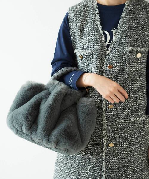 【秋冬ムードが増すファー素材】 程よい甘さのエコファーバッグ。 エコレザー素材で編みこんだブレードハンドルとふんわりコロンとしたシルエットが可愛いバッグです。 たっぷりな収納力も魅力のひとつ。 肌触りの柔らかいファーバッグははスタイリングに季節感をプラスすることができます。