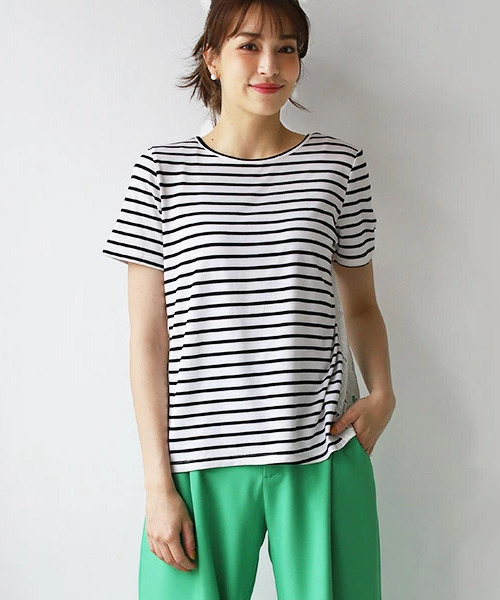 ボーダーとバックのフラワーレースがオトナ可愛いトップス?前後差があり、パンツ・スカートともに相性の良い着丈。伸縮性に優れており、レース部分の通気性で夏でも快適な1枚です! 手洗いにてお手入れしてください。[サイズ(cm)]M:総丈 前55 後ろ62 バスト90 袖丈20 袖口幅15