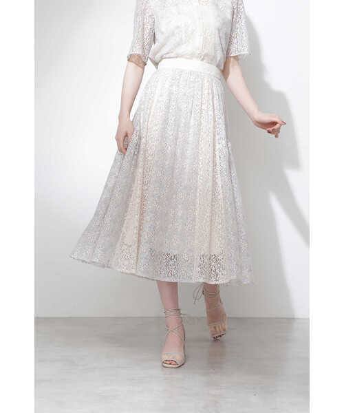 ボタニカル染めをあしらった華やかなレーススカート配色レースを使用した優しい色合いが特徴となり、一枚で着映え感のある装いに。グラデーションのように表現されたカラーを主役にしてニットやカットソーと合わせると、ふんわりと柔らかいシルエットが際立ちます。同素材のプラントダイレースブラウス(店舗品番0922110039)とセットアップでシャツワンピース風のコーディネートもおすすめです。