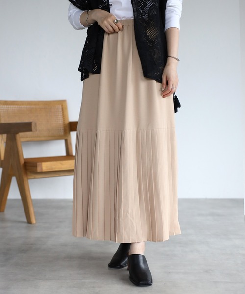 個性派デザインプリーツスカート 裾にプリーツデザインがあることで、メリハリが出てウエストからヒップ周りをスッキリと見せてくれます。 ウエストは総ゴムで楽ちん仕様!どんな予定にも迷わず着られるのが嬉しい♪ ついつい、マンネリ化しがちな無地スカートもデザインスカートで自分らしさをプラス○ カラーは着回し力抜群のキレイ目アイボリー、トレンドかつ女性らしさを演出してくれるスモーキーピンク、カジュアルにも取り入れやすいカーキの3色展開です。 ※アイボリーはベージュ寄りのカラーです※ ○おすすめスタイリングはトップスイン○ 裾にかけてプリーツがあり広がっていくので、トップスはあえてインすることメリハリがつき、ウエストが締まって見えます! ◆《お気に入り登録》がオススメ◆ ・「商品のお気に入り登録」で再入荷通知や、ラストの通知、セール通知も受け取ることが出来ます。 ・「ブランドのお気に入り登録」で新商品や再入荷など、お得な情報を受け取ることが出来ます。 ※撮影時のライティング、ご覧になっているモニター・PC環境により、実際の商品と色味が異なって見える場合がございます。予めご了承をお願い致します。 ※モデル着用画像は実際の色と多少異なる場合がございますのでトルソー画像をご確認ください。