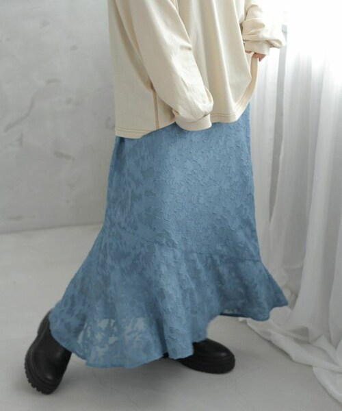 大人フェミニンな雰囲気漂うマーメイドスカート。 リーフ柄調のジャガード生地でスタイリングに華やかさをプラスしてくれます。 裾に向かって広がるシルエットが女性らしく、身体のラインを拾い過ぎずに綺麗見せも◎ アシンメトリーな切り替え位置でスタイルアップ効果があるのも魅力的。 ブラウスやシャツを合わせたきれいめスタイルはもちろん。 丈の長いTシャツとのルーズな着こなしもこなれ感がありおすすめです。 やや短めの裏地にすることで足元にシアー感を出しより軽やかな仕上がりに。 バックウエストはゴム仕様でストレスフリーな穿き心地が叶います。 サイドファスナーで着脱しやすいのも◎ 立体感のあるジャカード素材。 さらっとした肌触りで清涼感があり、快適に穿いていただけます。 裏地付きなので透け感が気にならないのも嬉しいポイント。